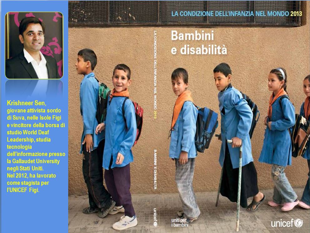 Di recente é stato presentato al mondo la condizione dell’infanzia nel mondo 2013. Questo rapporto dell’Unicef é avente per il titolo “Bambini e disabilità. Riportiamo la pagina che riguarda la sordità: “Per i giovani sordi, il linguaggio è fondamentale”, scritta da “Krishneer Sen, giovane attivista sordo di Suva, nelle Isole Figi e vincitore della borsa di studio