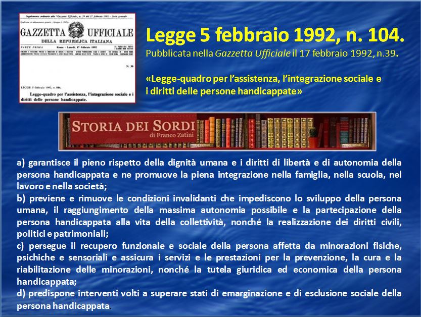 Troppe leggi sono demagogiche, specchietto per allodole, ignavia e negligenza intellettiva di parlamentari nel risolvere i bisogni reali dei cittadini problematici. A questo punto è la società a creare l’handicap, ad emarginare il cittadino senza udito, senza vista e così via!