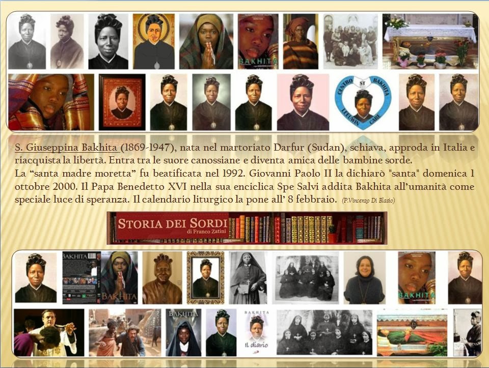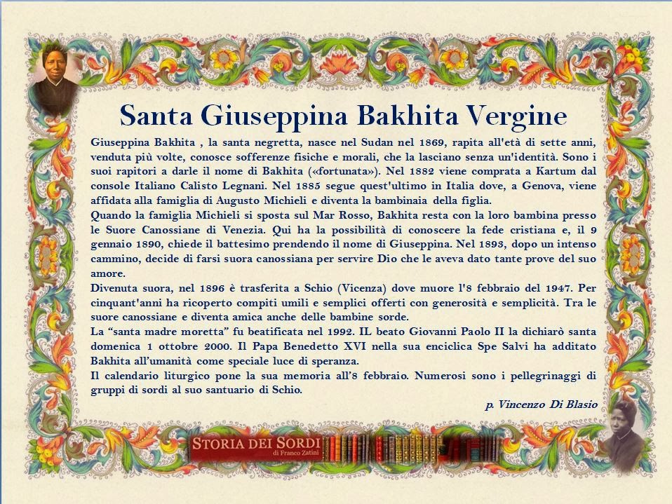 Schio (Vicenza). Santuario di Santa Giuseppina Bakhita e la storia dei sordi. Santa Giuseppina Bakhita Vergine, la santa negretta, nasce nel Sudan nel 1869, rapita all’età di sette anni, venduta più volte, conosce sofferenze fisiche e morali, che la lasciano senza un’identità. Sono i suoi rapitori a darle il nome di Bakhita («fortunata»). Nel 1882 viene comprata a Kartum dal console Italiano Calisto Legnani. Nel 1885 segue quest’ultimo in Italia dove, a Genova, viene affidata alla famiglia di Augusto Michieli e diventa la bambinaia della figlia.