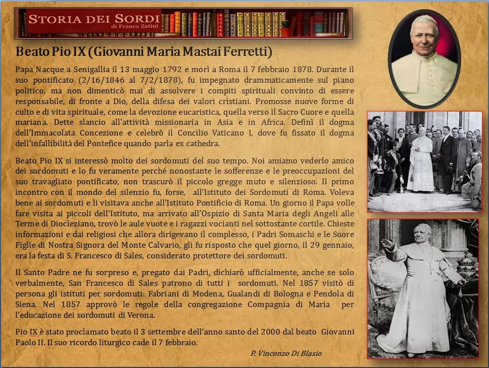 Beato Pio IX si interessò molto dei sordomuti del suo tempo. Noi amiamo vederlo amico dei sordomuti e lo fu veramente perché nonostante le sofferenze e le preoccupazioni del suo travagliato pontificato, non trascurò il piccolo gregge muto e silenzioso.
