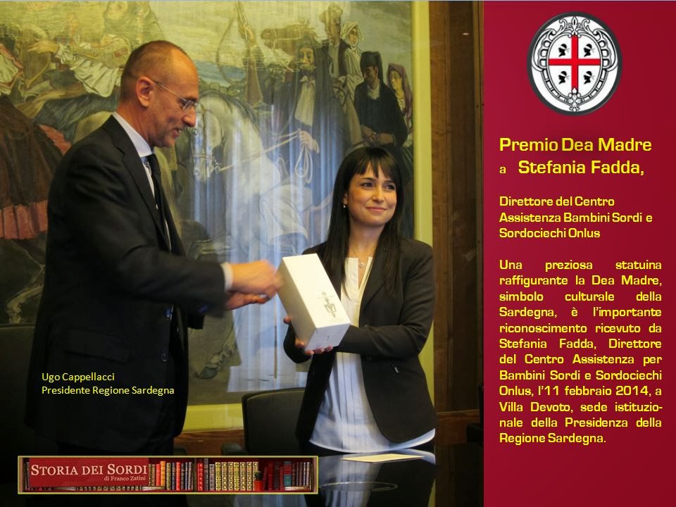 Premio Dea Madre a Stefania Fadda, Direttore del Centro Assistenza per Bambini Sordi e Sordociechi Onlus. Una preziosa statuina raffigurante la Dea Madre, simbolo culturale della Sardegna, é l’importante riconoscimento ricevuto da Stefania Fadda, Direttore del Centro Assistenza per Bambini Sordi e Sordociechi Onlus, ieri (11 febbraio, n.d.r.), a Villa Devoto, sede istituzionale della Presidenza della Regione Sardegna.