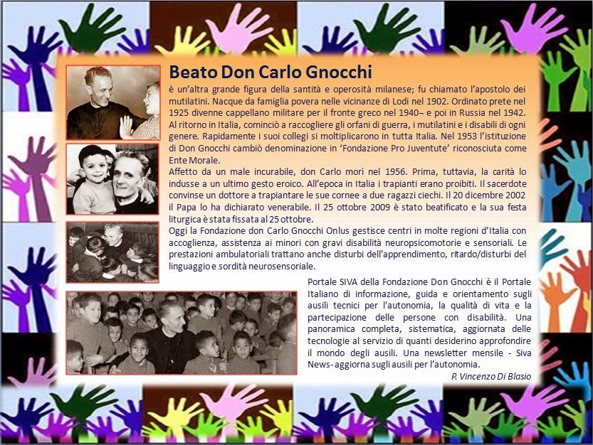 Beato Don Carlo Gnocchi nel ricordo della storia dei sordi. Il beato Carlo Gnocchi è un’altra grande figura della santità e operosità milanese; fu chiamato l’apostolo dei mutilatini. Nacque da famiglia povera nelle vicinanze di Lodi nel 1902. Ordinato prete nel 1925 divenne cappellano militare per il fronte greco nel 1940¬ e poi in Russia nel 1942.