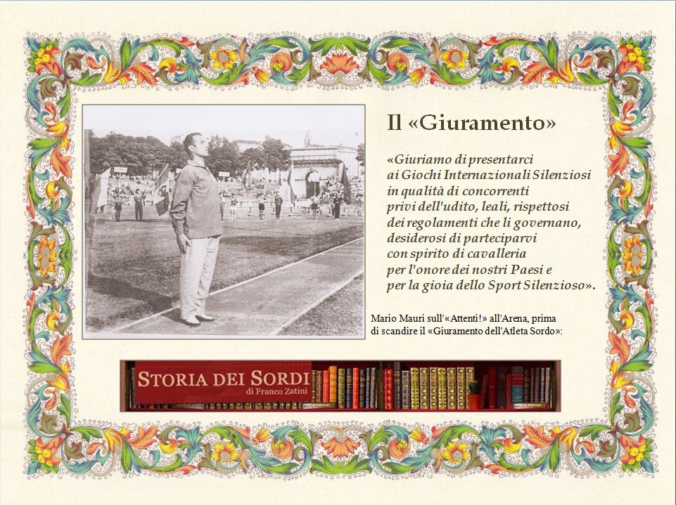 Un atleta avanzò – si trattava di Mario Mauri, N.d.A – sul piccolo palco, al Pulvinare dell’Arena Civica, e la sua dichiarazione che era il giuramento sulla autenticità dei sordomuti i quali si sarebbero battuti ugualmente per la gloria e la lealtà dello sport, fece alzare dagli spalti, che contenevano migliaia di persone, un inno all’umanità che vince ed impone alla gente di cuore e di volontà all’attenzione del mondo.